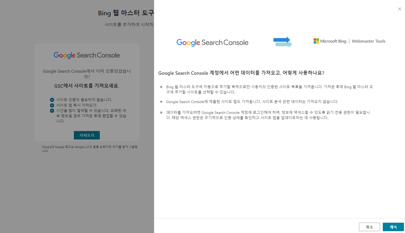 Bing의 경우 이미 구글 서치콘솔에 등록한 정보가 있다면