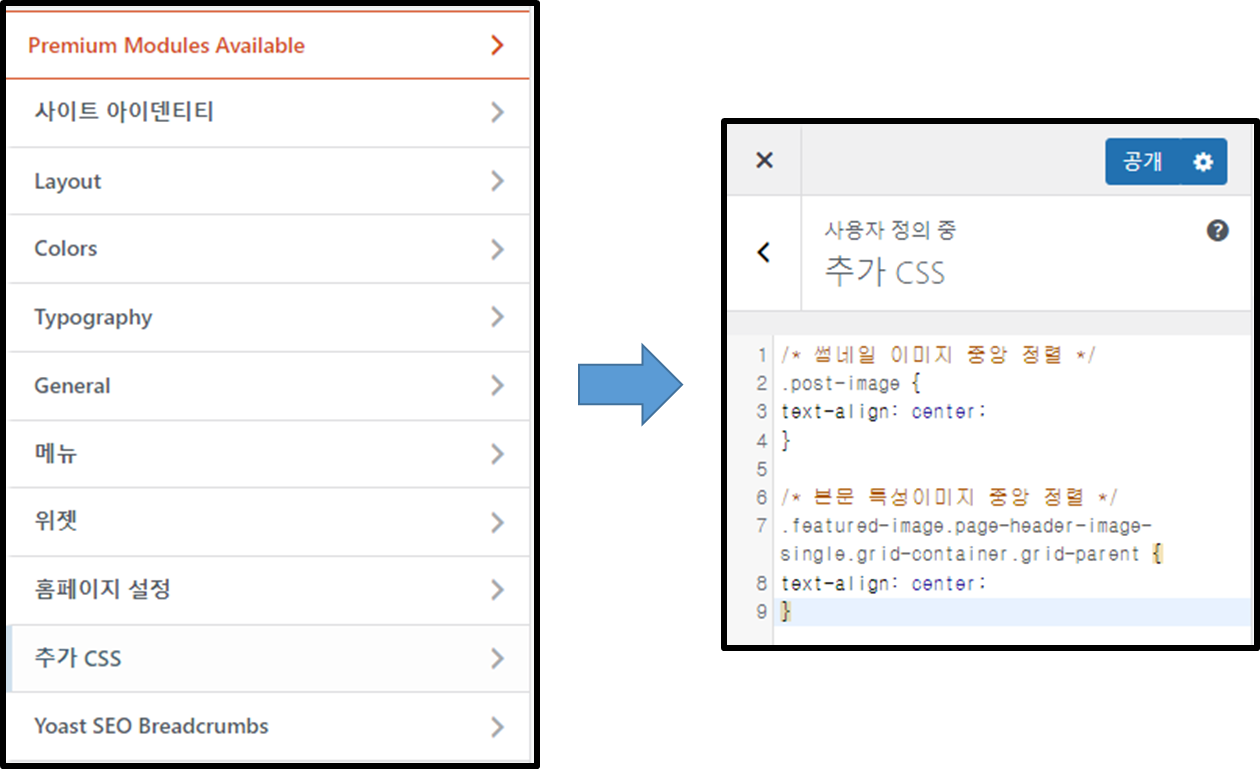 워드프레스 관리자 > 외모 > 사용자 정의하기 > 추가 CSS